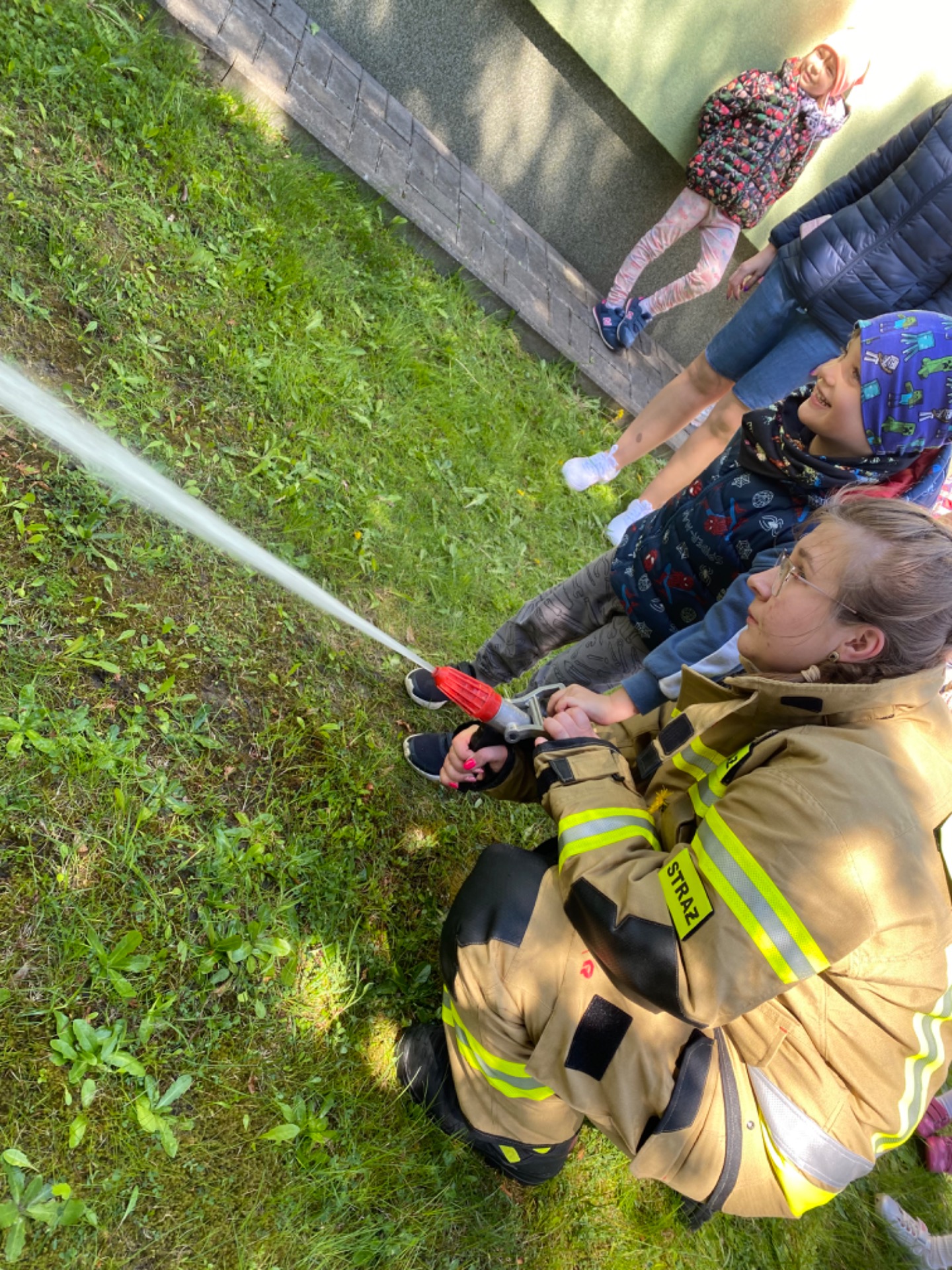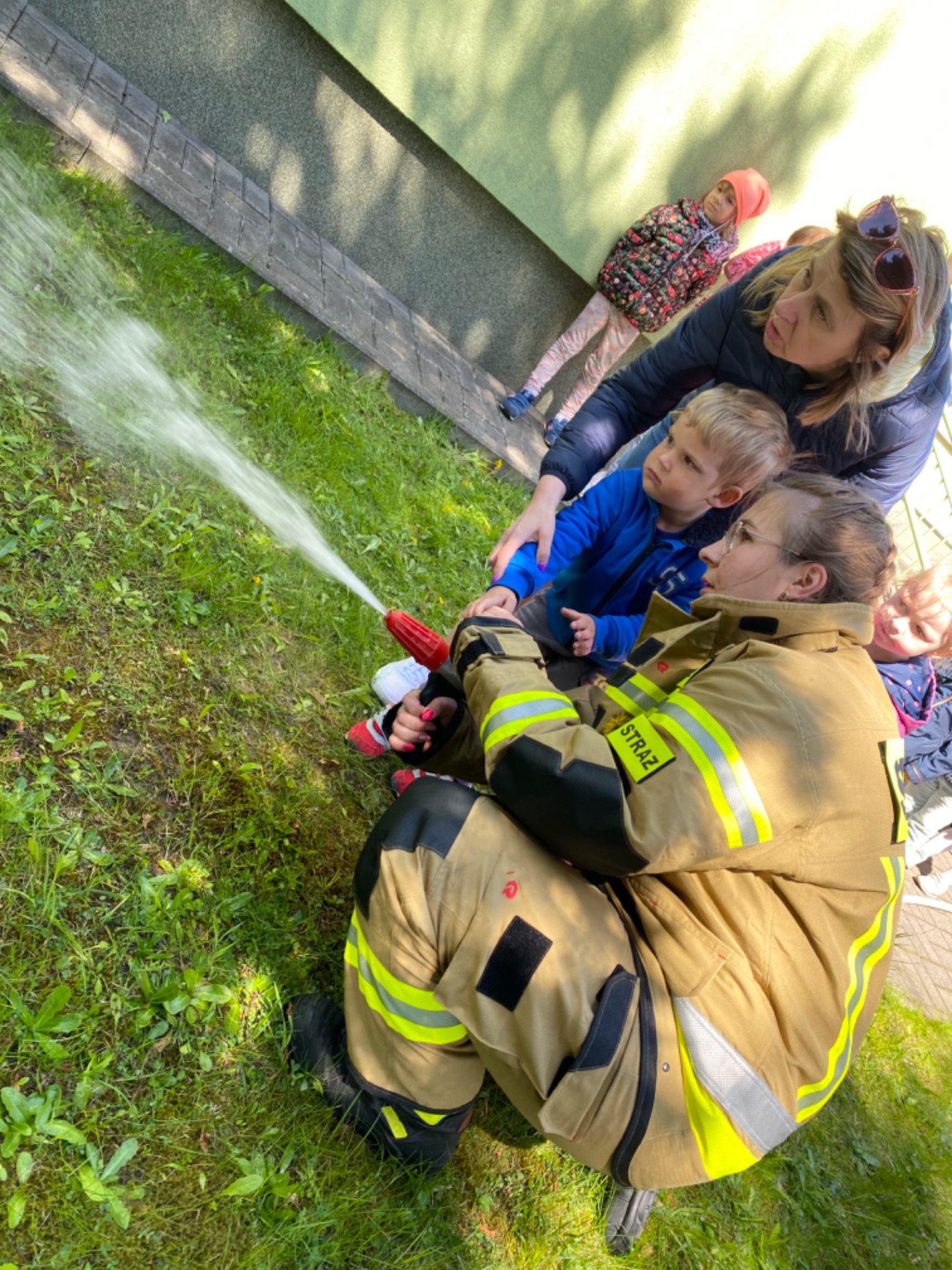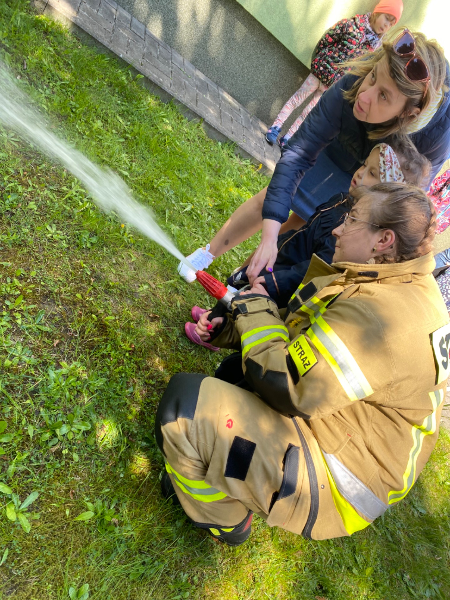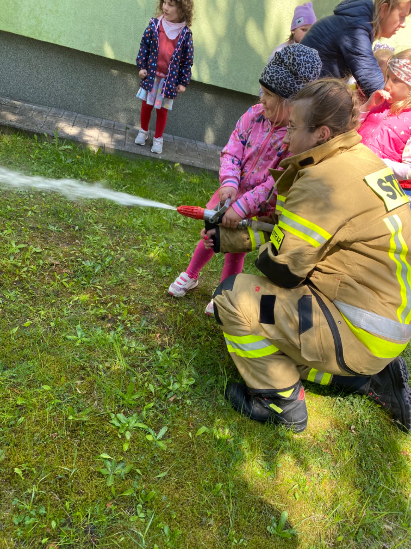Smerfy, najmłodsze przedszkolaki, w ramach projektu realizowały moduł "Kicia Kocia poznaje strażaka". Przedsięwzięcie to zorganizowaliśmy z rozmachem zapraszając najprawdziwszych strażaków, którzy 9 maja zawitali do naszego przedszkola czerwonym wozem strażackim! Wizyta OSP ze Starej Niedziałki była ogromną atrakcją dla wszystkich dzieci z przedszkola. W trakcie spotkania dzieci dowiedziały się jak wygląda strój strażaka, mogły z bliska zobaczyć wyposażenie wozu strażackiego i spróbować swoich sił w przewracaniu pachołków wodą lejącą się ze strażackiego węża. Przedszkolaki zdobyły również wiedzę o tym, do jakich zdarzeń są wzywani strażacy oraz w jaki sposób dokonuje się wezwania. Spotkanie ze strażakami bardzo uatrakcyjniło nasze przedszkolne zajęcia i wywołało wiele pozytywnych emocji. Bardzo dziękujemy Druhom i Druhnom z OSP Stara Niedziałka za poświęcony nam czas oraz przewodniczącej oddziałowej Rady Rodziców p. Monice za pomoc w organizacji tego spotkania.