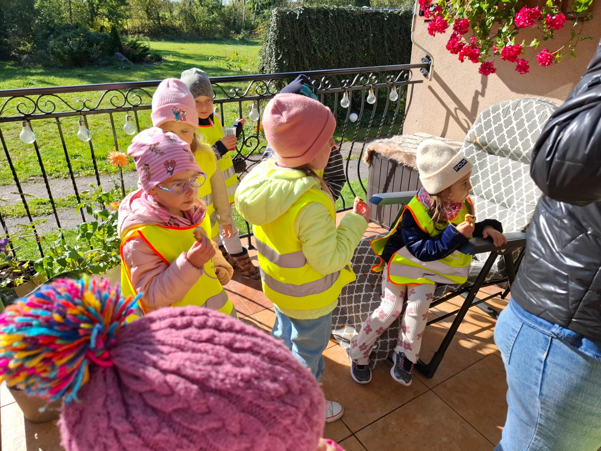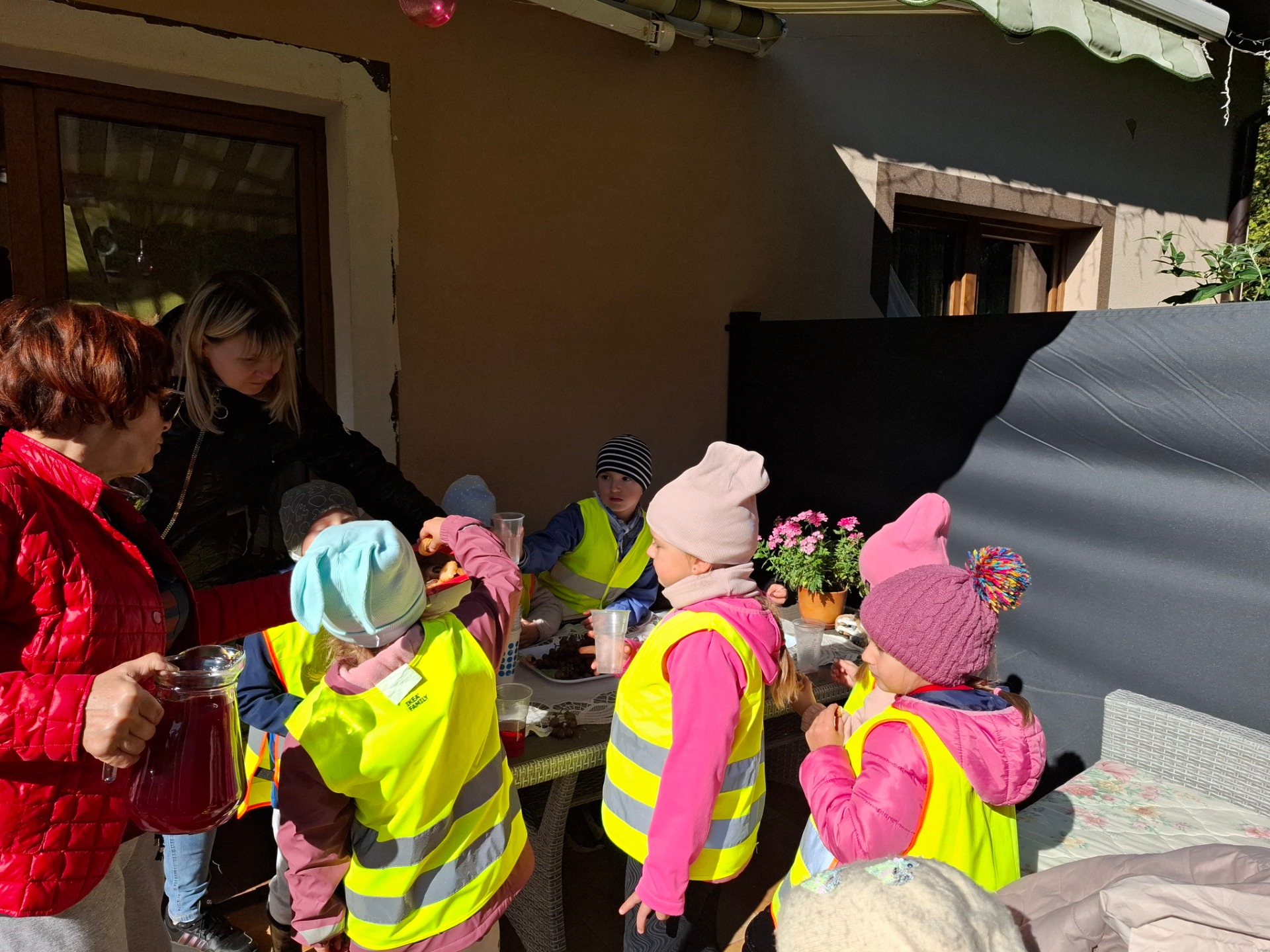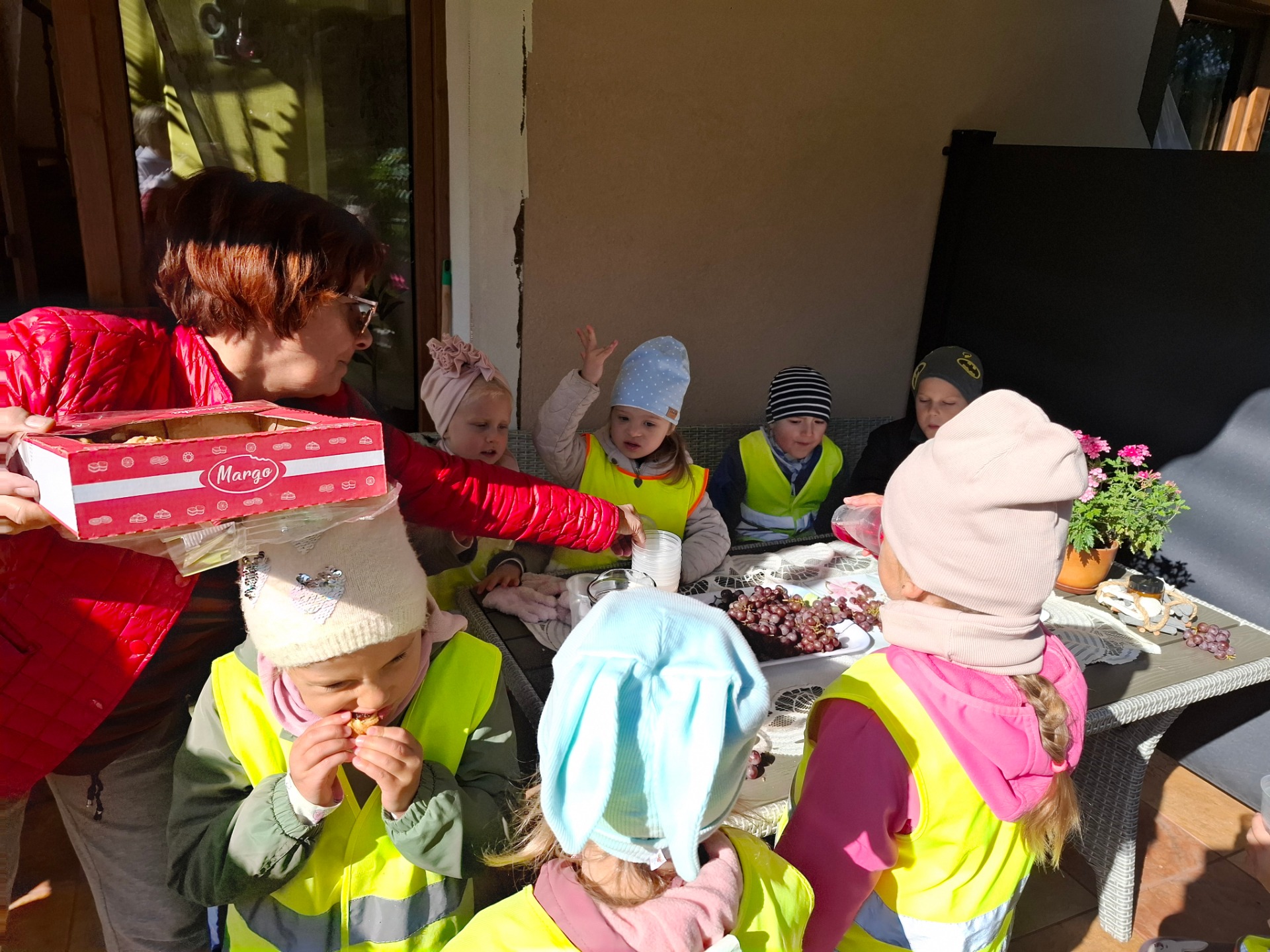 Nasza niezawodna Pani Krysia Zawadzka zaprosiła 5 -latki na swoje podwórko i pokazała jak z bliska wyglądają panele fotowoltaiczne a następnie zaproponowała prawdziwą ucztę - owoce, ciastka i domowy kompot.