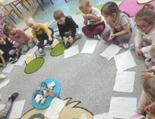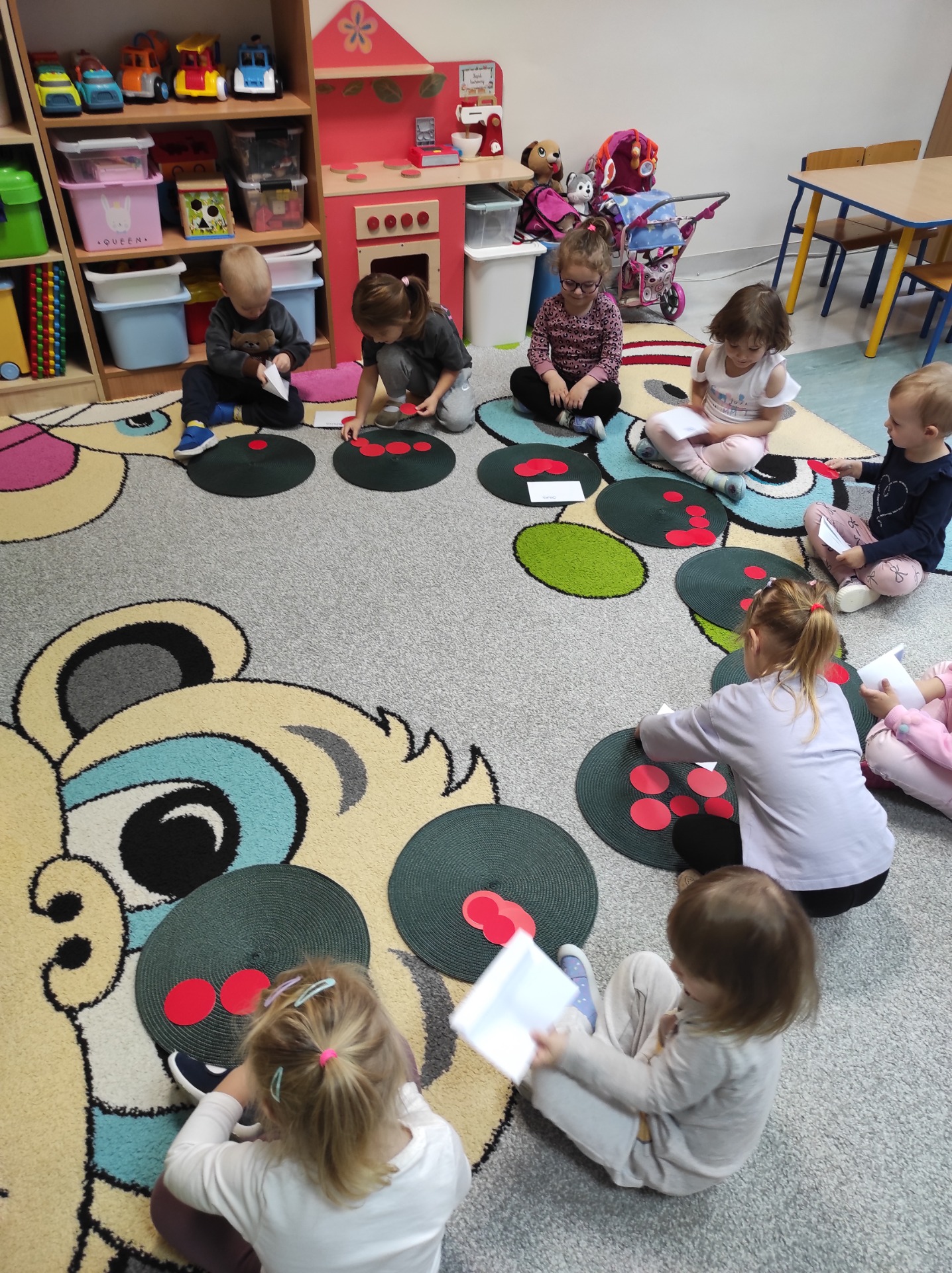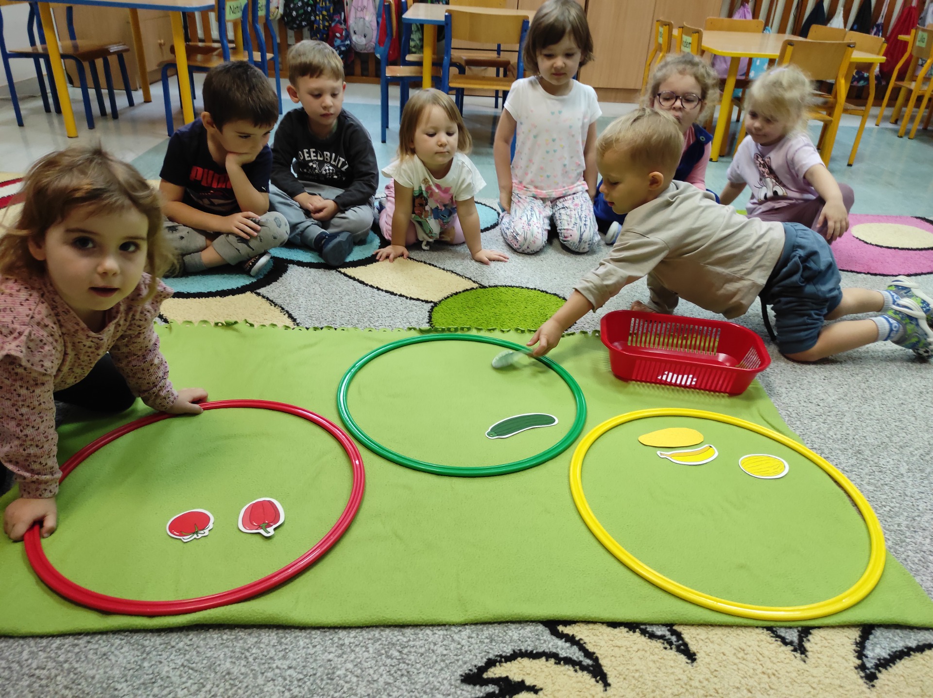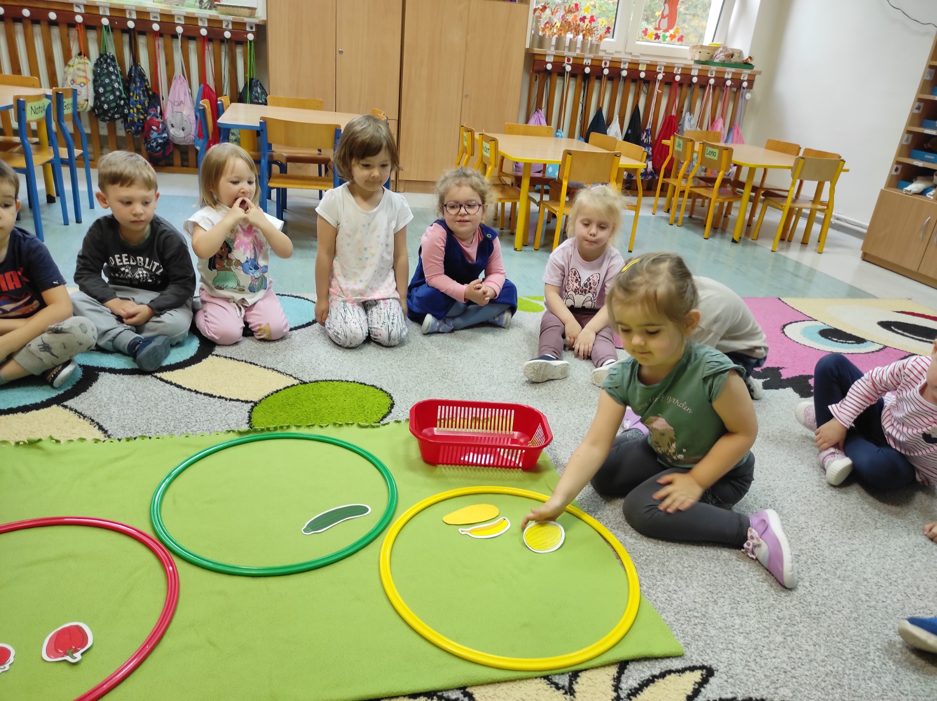 Październik upłynął Żabkom na aktywnościach związanych z tematyką jesienną. Przedszkolaki określały jesienne kolory, poznawały dary jesieni, wykonywały prace plastyczne z ich użyciem. W czasie zabaw matematycznych poznały figurę geometryczną - koło, ćwiczyły umiejętność przeliczania w zakresie trzech elementów. Gdy pogoda nie sprzyjała zabawom na dworze, Żabki rozwijały sprawność fizyczną w czasie zajęć gimnastycznych w sali. W ramach edukacji zdrowotnej obchodziliśmy "Dzień mycia rąk", podczas którego dzieci wykonały eksperyment pokazujący, jak roznoszą się zarazki oraz uczyły się prawidłowej techniki mycia rąk. W październiku odbyły się także pierwsze zajęcia z projektu patriotycznego pt. "Podróż przez Polskę".
