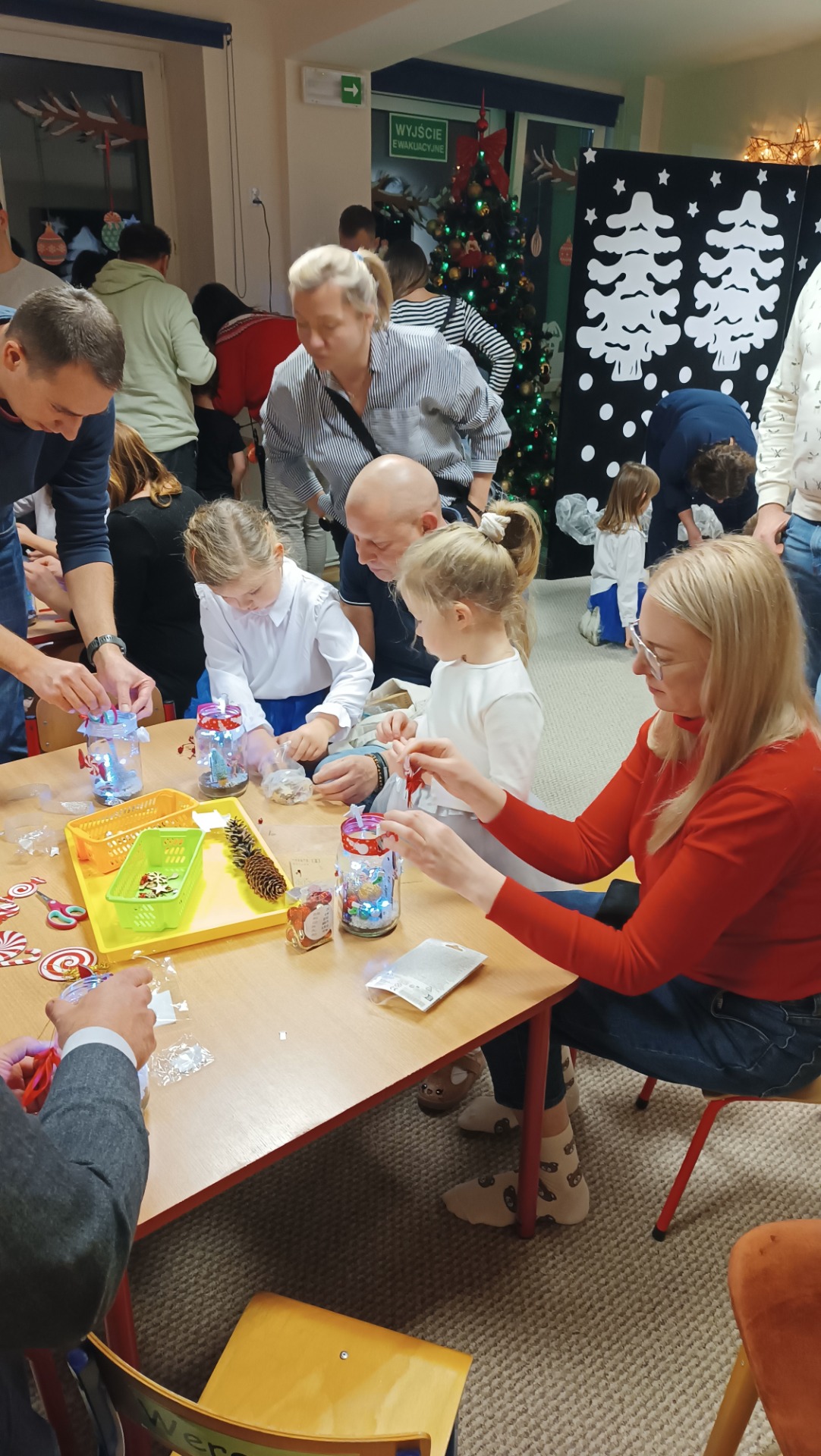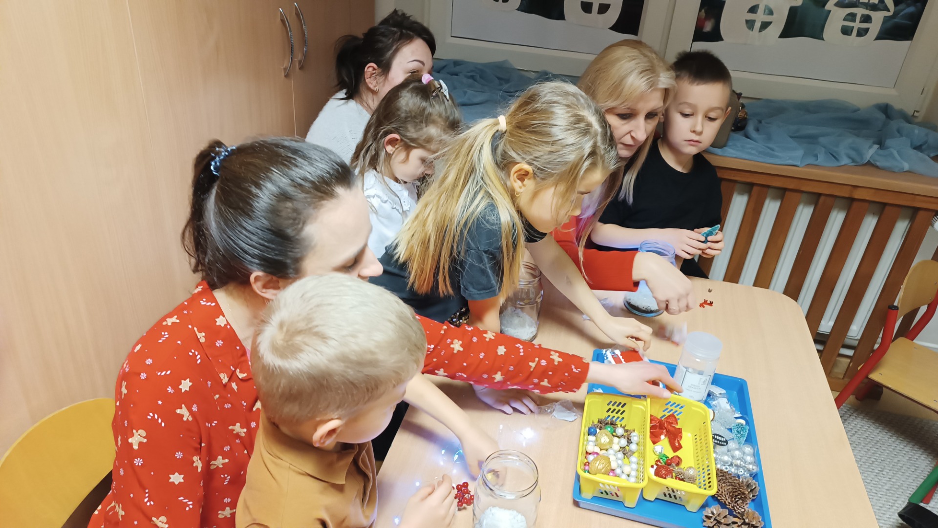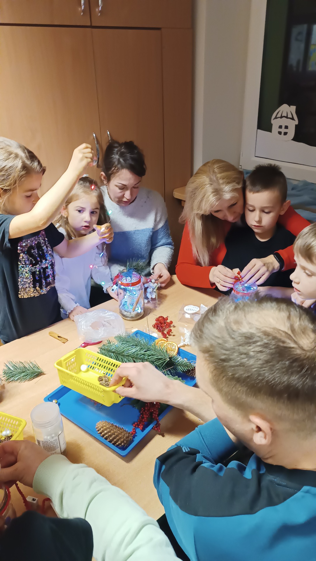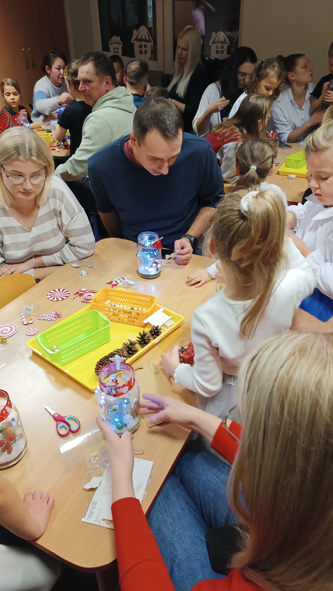 Rodzice z dziećmi tworzą świąteczne lampiony