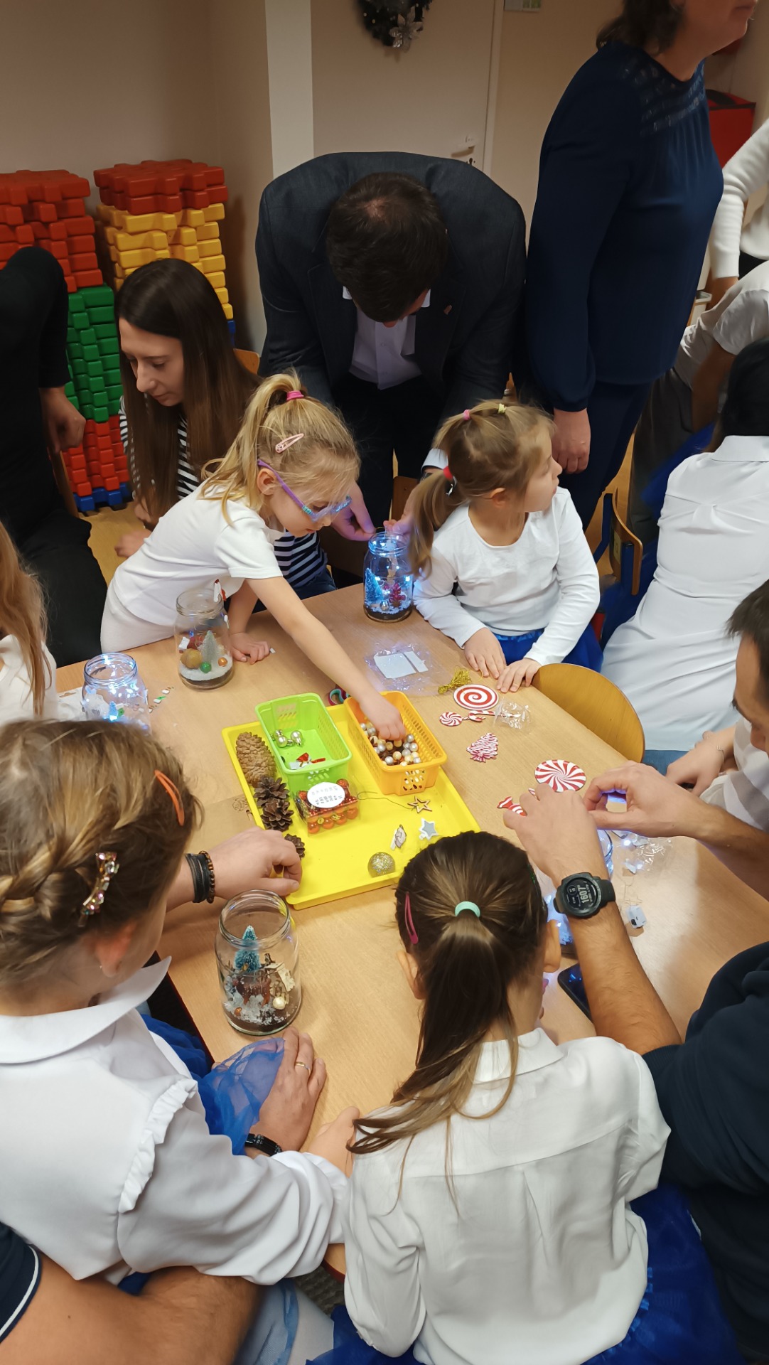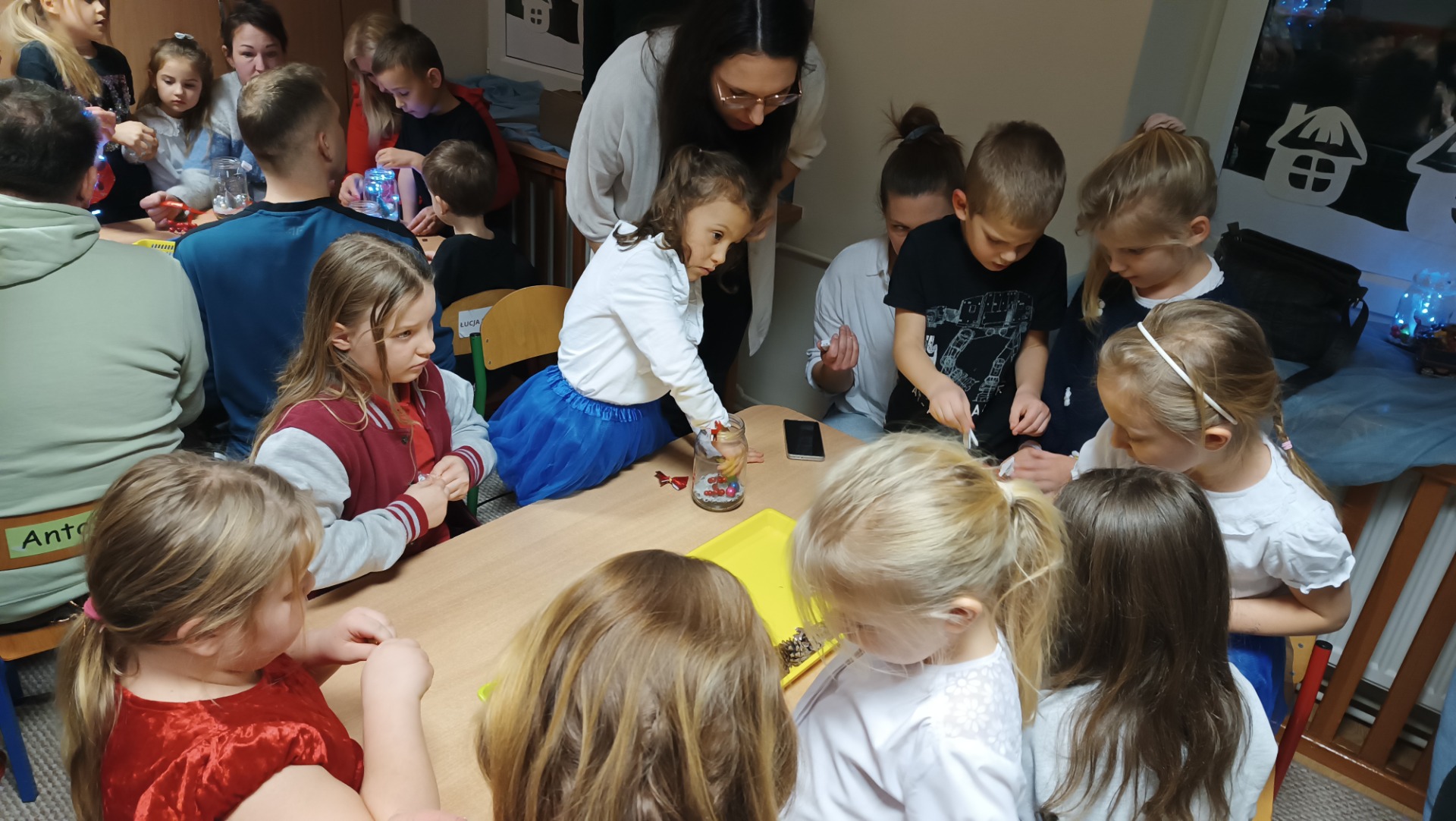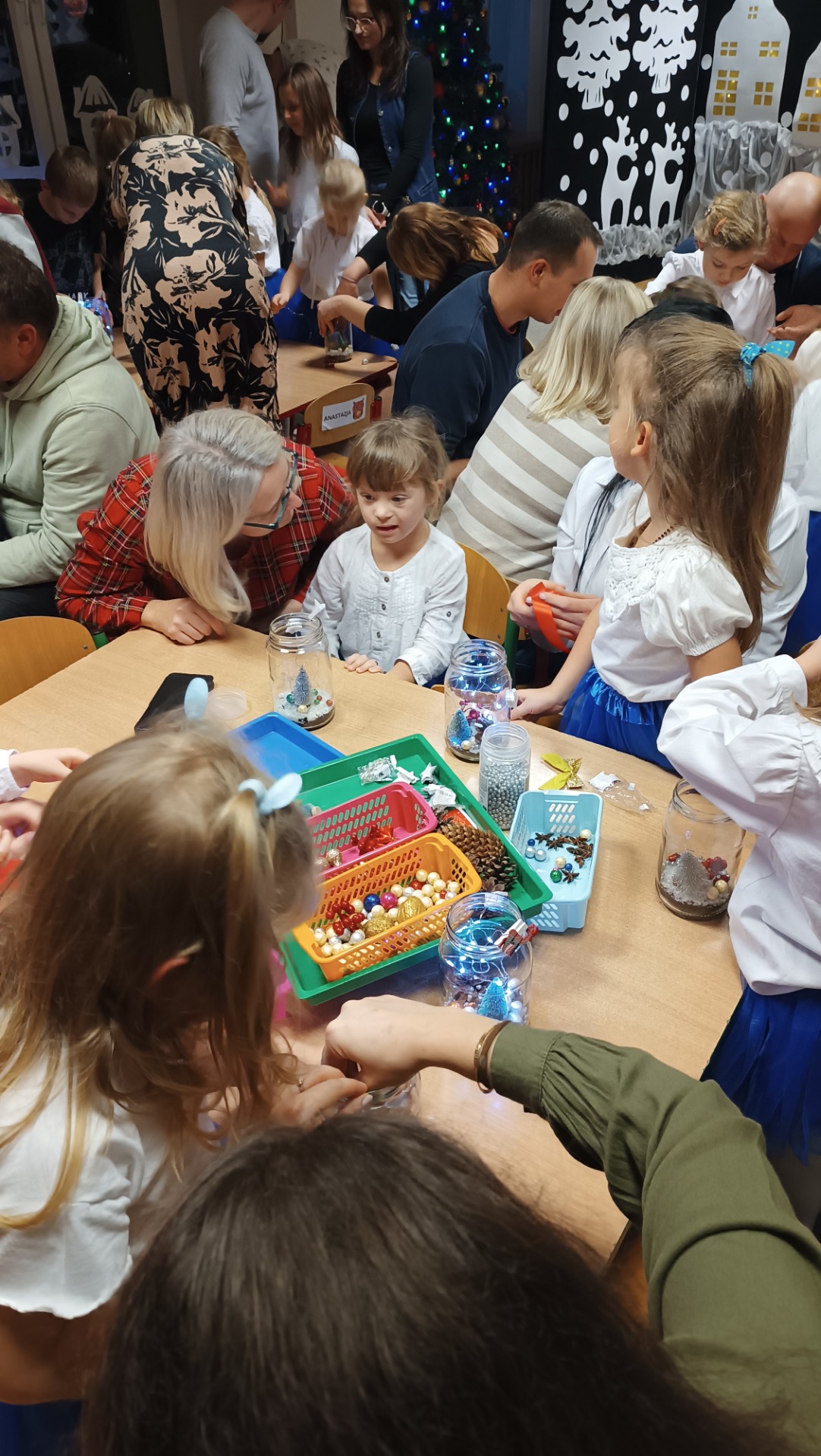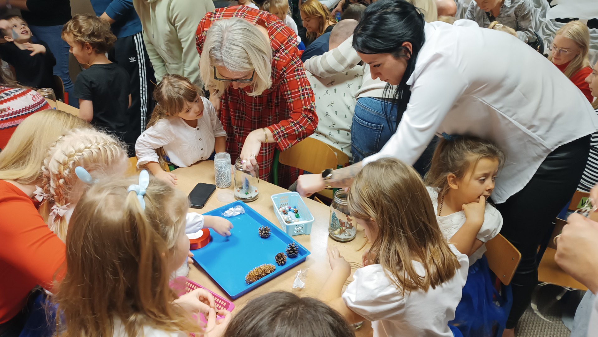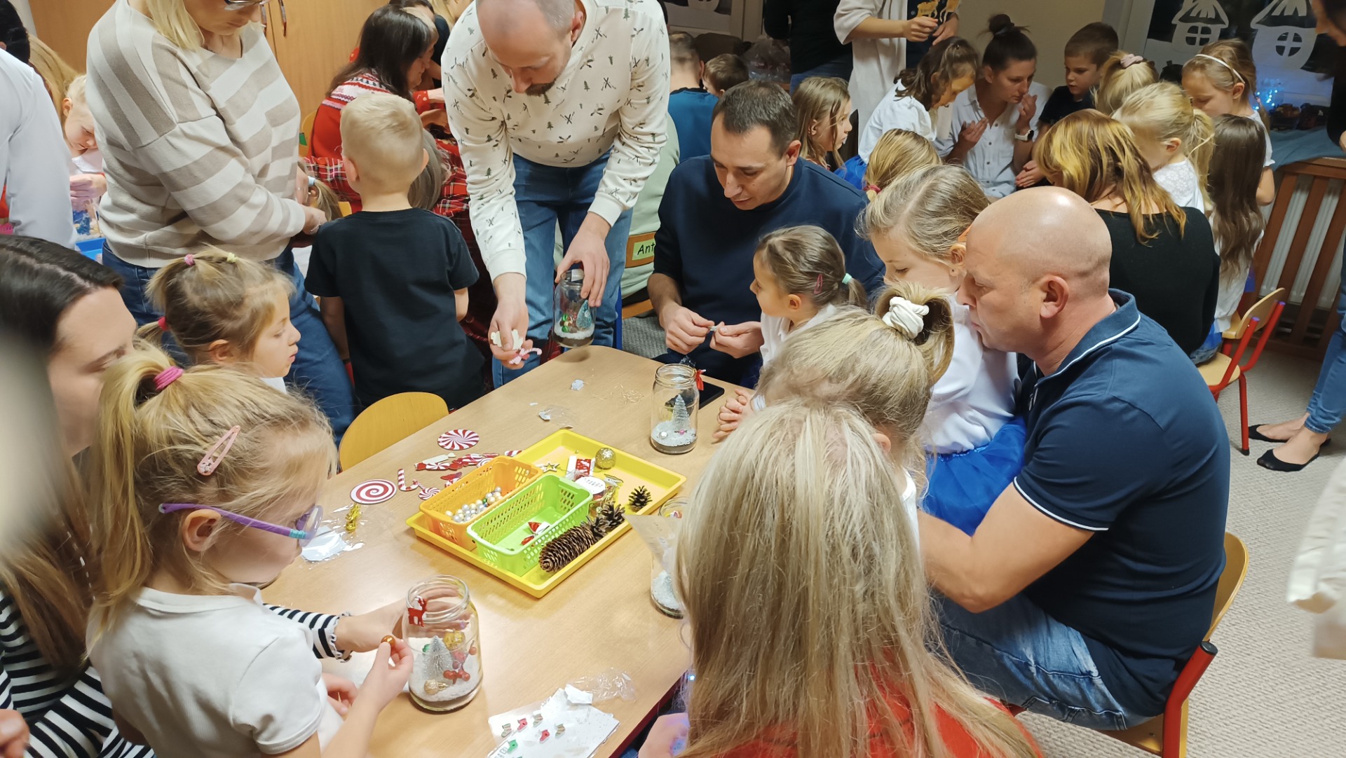 Rodzice z dziećmi tworzą świąteczne lampiony