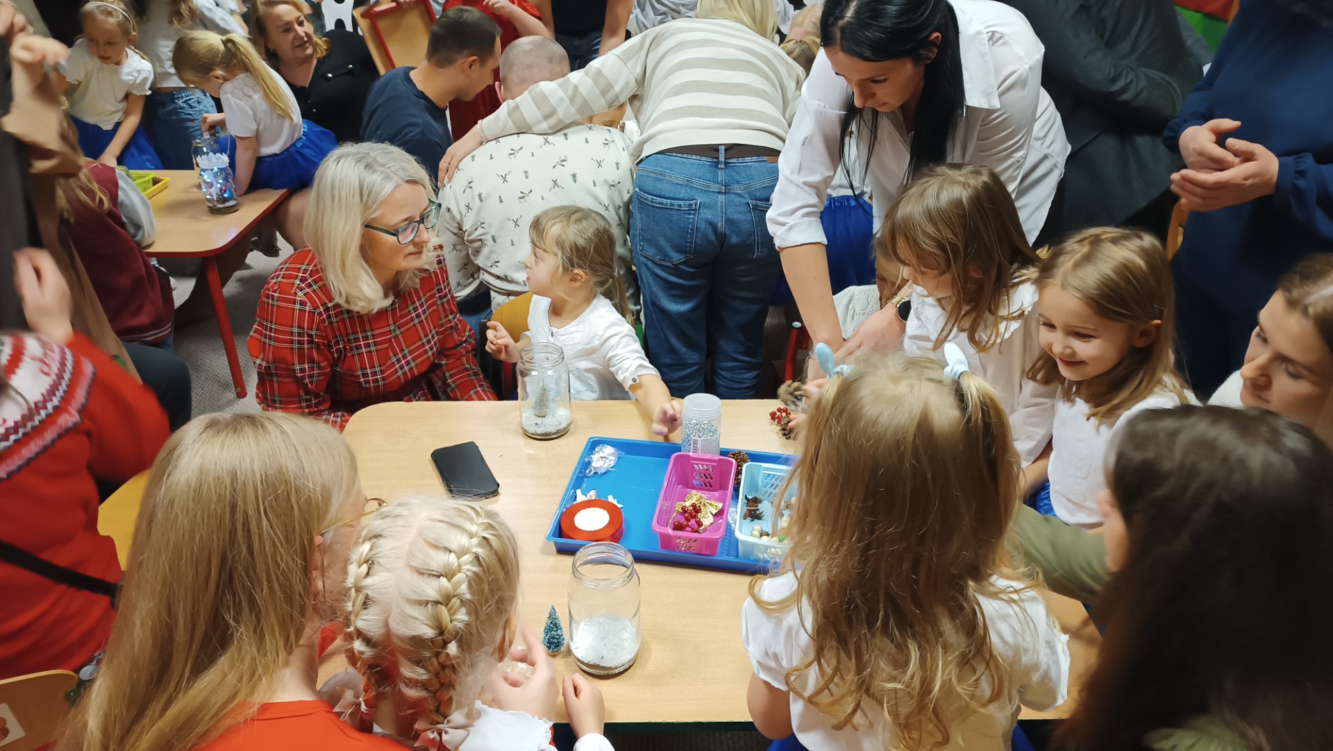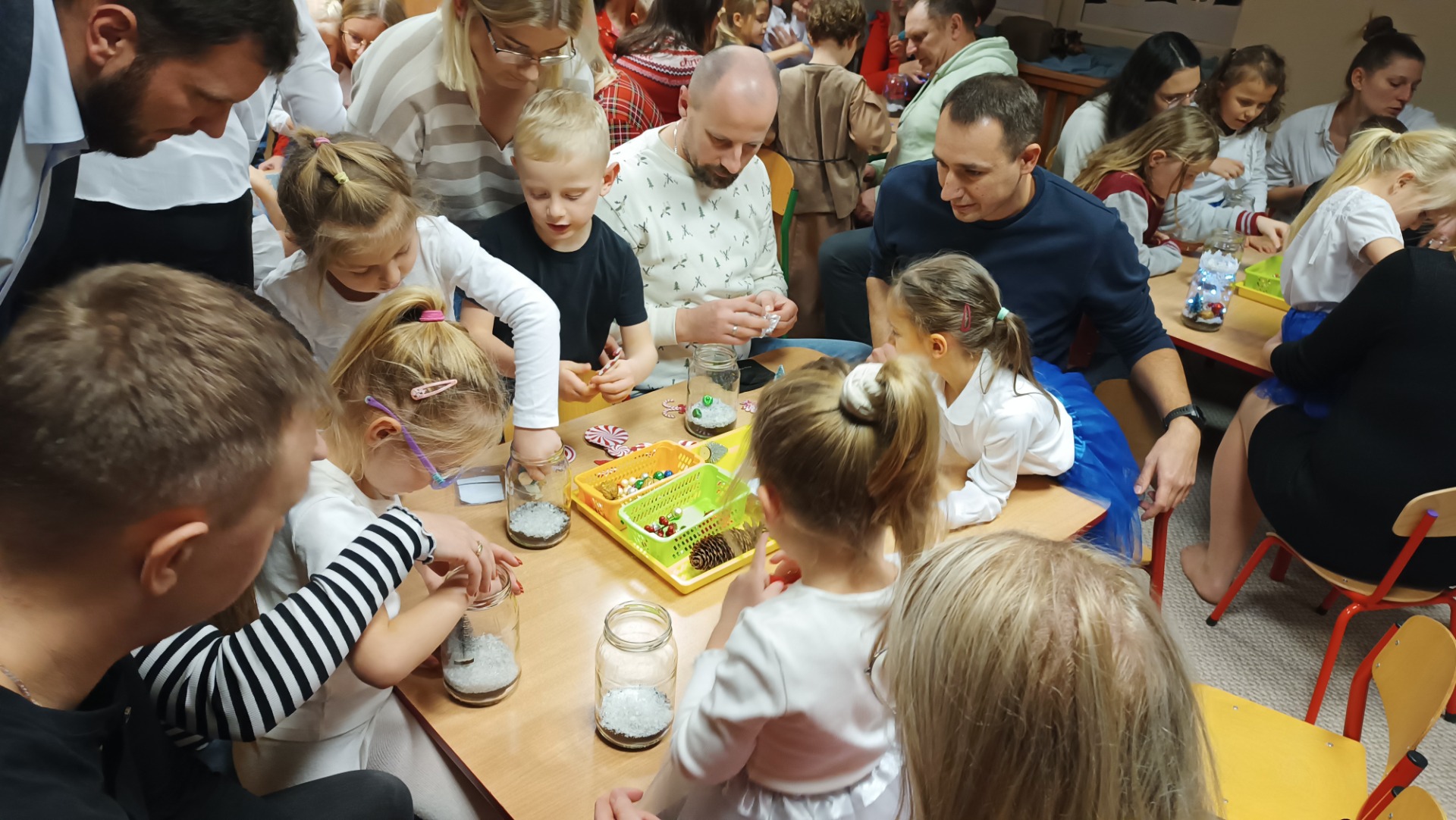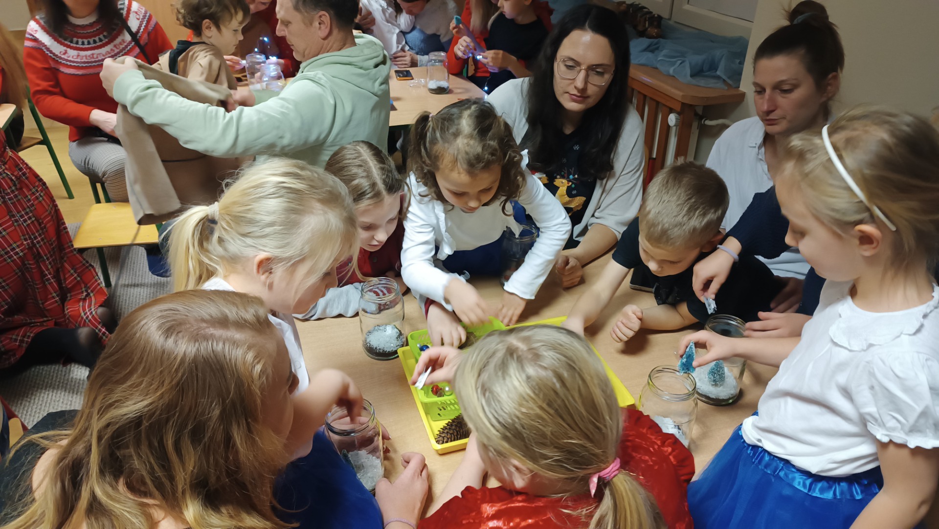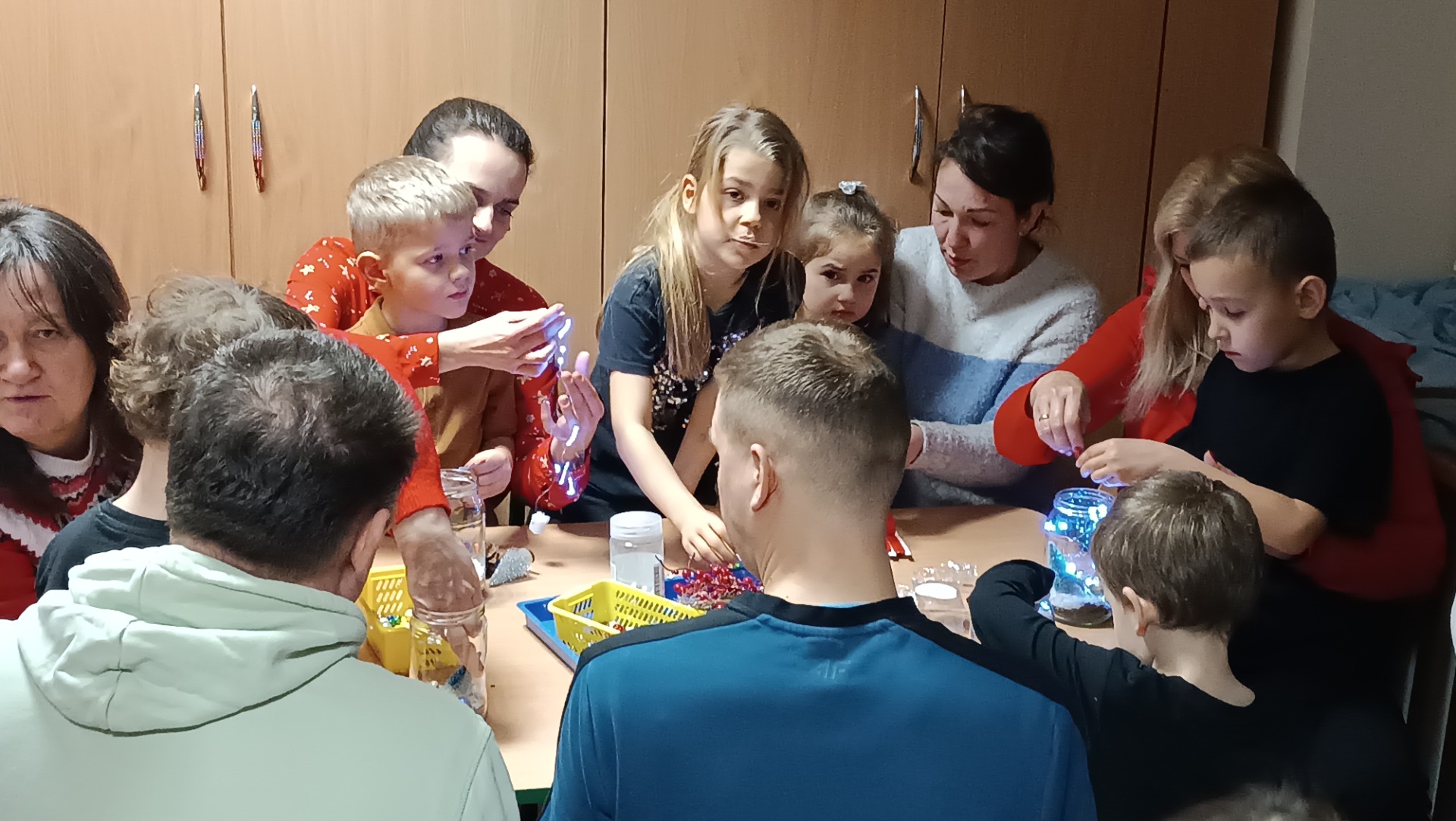Rodzice z dziećmi tworzą świąteczne lampiony